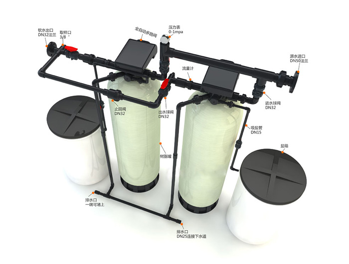 软化水设备是由全自动软水控制器、盐箱、强酸型钠离子阳树脂、树脂罐(一般为不锈钢树脂罐和玻璃钢树脂罐)、以及软水器配件组成。通过水的流量和时间控制的方式发出指令给电磁阀或多路通伺服阀,来完成软化水设备的供水和再生,是工业锅炉、冷却循环水、炼钢、轧钢、大型变压 器、民用热水锅炉等场合中应用最为广泛的硬水软化处理设备。