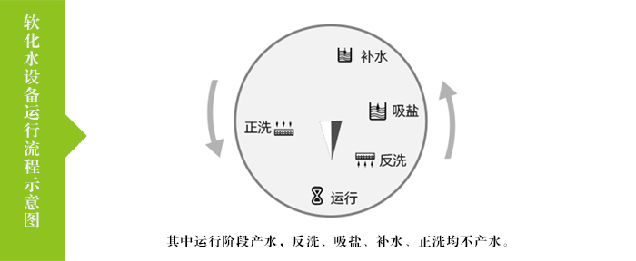 工作(有时叫做产水,下同)、反洗、吸盐(再生)、慢冲洗(置换)、快冲洗五个过程。不同的全自动软化水设备的所有工序非常相似,只是由于实际工艺的不同或控制的需要,可能会有一些不同的附加的流程。任何以钠离子交换为基础的全自动软化水设备都是在这五个流程的基础上发展变动而来的(其中,全自动软化水设备会增加盐水重注过程!