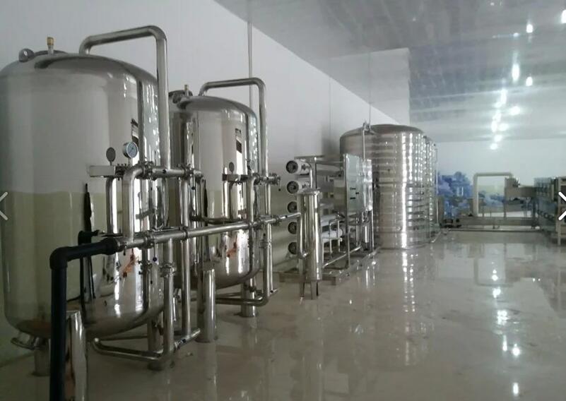 原水----原水箱----增压泵------石英砂过滤器-----活性碳过滤器-------树脂过滤器------盐箱-----净水主机------紫外线杀菌器-------纯水箱-------上瓶滑道-----风送道------三合一灌装机-------自动理盖器--------灯检箱-----套标机-----缩标机-----全自动热收缩包装机-------成品