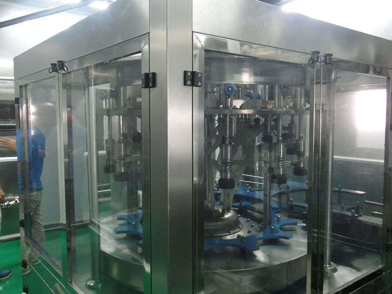 本系列设备用于聚脂瓶装各种纯净水、矿泉水的生产。在一机上实现冲瓶、灌装、封盖。整机设计科学合理,外形美观,功能齐全,操作维修方便,自动化程度高。综合采用意大利、德国先进技术。灌装速度快,液面控制稳。采用风送进瓶、夹瓶口、冲洗、卡瓶口灌装、封盖、不受瓶子高矮限制,只要瓶口、瓶盖相同随意更换瓶形,更换一下拔轮板即可。油尼龙齿轮传动,噪声小,整机运转平稳。采用磁力扭矩式拧盖头,实现抓盖、拧盖功能。拧盖力矩无级可调,具有恒力矩旋封塑盖功能,且不伤盖,封口严密可靠。水平回转式气力理盖器,具有不损坏瓶盖表面,料斗内缺盖发信号自动补充盖等功能。整机采用PLC电脑程序控制及人机界面触摸屏按钮,具有料缸内液面自动控制,无瓶不灌装,无瓶不加盖功能,并有拨瓶星轮卡瓶错位停机,盖滑槽内缺盖停机等功能。